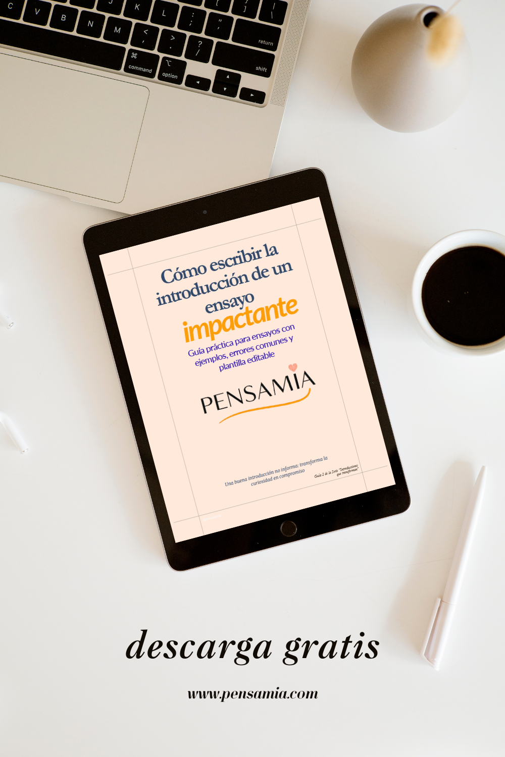 Del Método PENSAMIA surge esta guía con el paso I (Introducción). Dirigida a quienes están escribiendo o planificando la escritura de un ensayo o artículo reflexivo. La pueden usar para ensayos de la universidad, para postular a becas, para solicitar el ingreso a un grupo de trabajo. Es la Guía 2 de la Serie «Introducciones que transforman».